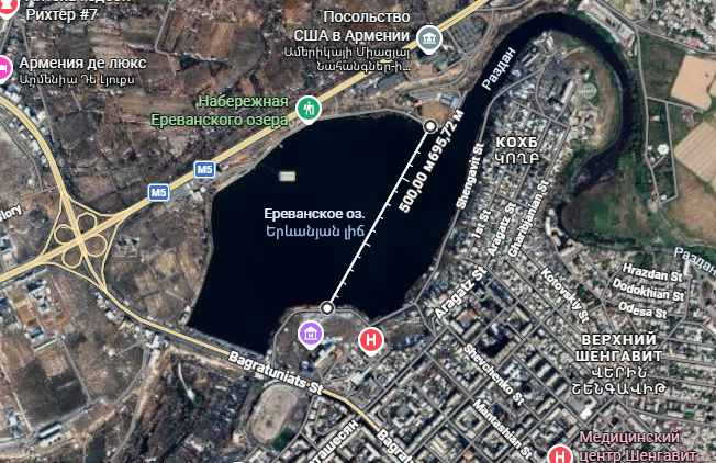 Создание достопримечательностей не должно останавливаться. . Похоже, посольство США в Армении единственное из себе подобных, имеющее береговую линию. . Вот почему следовало отвезти Вэнса на экскурсию/инспекцию туда на лодке, сделанной по типу древнего армянского корабля, доставив его от энеолитического поселения Шенгавит (примерно 700 метров по прямой - маршрут обозначен белой линией), потом лодку причалив там для последующих визитов, превратив её саму в достопримечательность.