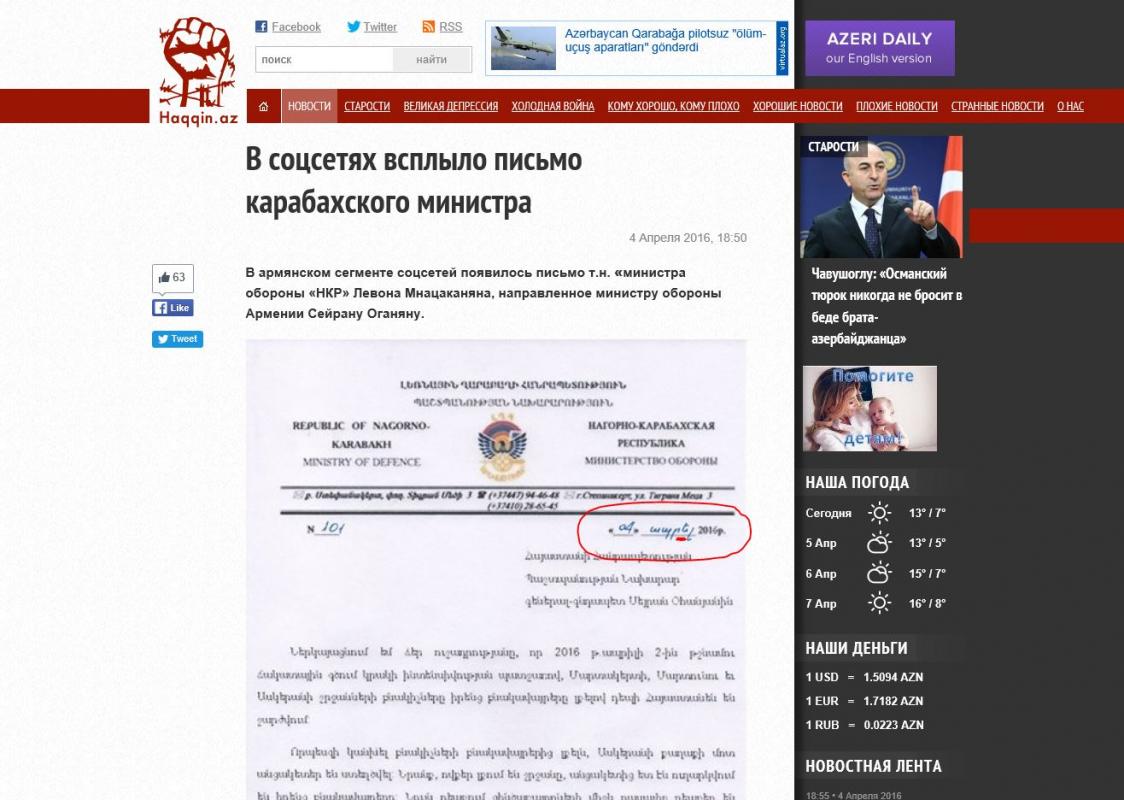 Haqqin.az распространяет фальшивое письмо от имени Министра обороны НКР Левона Мнацаканяна, направленное министру обороны Армении Сейрану Оганяну. Дебилы так и не научились фальсифицировать без грамматических ошибок, которые замечаю я со своим весьма поверхностным знанием армянского языка