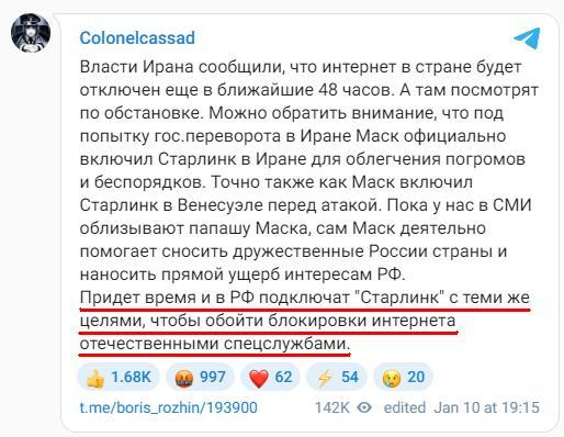 Чекисты пользуются Starlink-ом. Даже применяют его для прямого управления атаками (2:16-3:19): . Чтобы предотвратить это, я предлагаю ввести следующую систему. . Ежедневно, в определённый момент времени, Украина сообщает Маску новый код. . Этот код автоматически вставляется в сообщения со Starlink-ов ВСУ или же просто активирует данный терминал на 24 часа. . Если сообщение с терминала не содержит правильного кода, или терминал не подтвердил себя ранее новым кодом, то этот терминал Starlink не обслуживает, а его координаты передаются ВСУ.