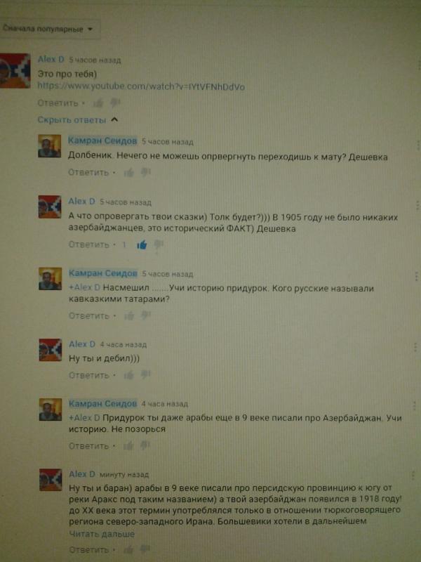 1. В Запорожье поймали азербайджанского пенсионера-педофила.В Запорожье (Украина) активисты сообщества «Наследие. Охота на педофилов» задержали очередного растлителя малолетних, сообщает сайт Ipnews.По информации сайта, им оказался 62-летний пенсионер Азер Велиев из Баку. «Сегодня нашей организацией была проведена встреча. Явился на встречу к девочке 13-ти лет. Также вел переписку с мальчиком 15-ти лет. Присылал интимные фото на все страницы. Страницы малолетних — фейки для разоблачения», — говорится в группе сообщества в соцсети.По словам мужчины, он приехал из Баку около двух месяцев назад. В Запорожье проходит лечение, живет у родственников.В своих ответах на вопросы активистов, мужчина признал выдвинутые в его адрес обвинения и заявил, что раскаивается. Однако, по словам молодых людей, разоблачивших его, видео «все равно будут выложены в сеть, чтобы отбить охоту у прочих любителей совращать малолетних».