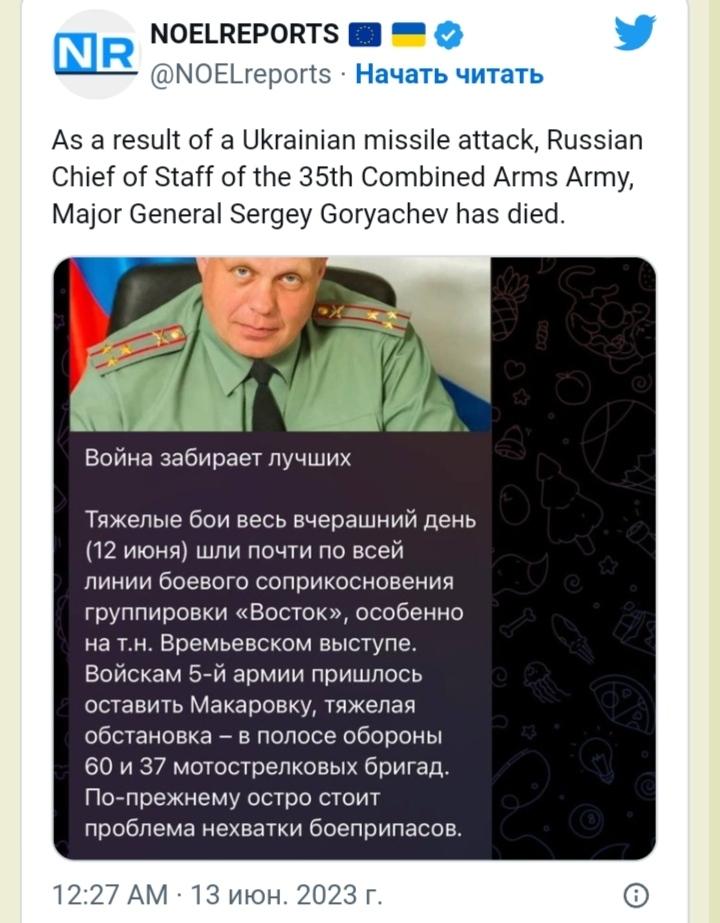 Коллеги, не ругайтесь... Совсем отошли от темы. А между тем происходят интересные события. ВСУ за неделю боев освободили ок. 100 кв. км в Запорожской области, а в "день России" захаймарсили штаб 35-й общевойсковой армии РФ. Убит генерал-майор начальник штаба, и наверное не он один.