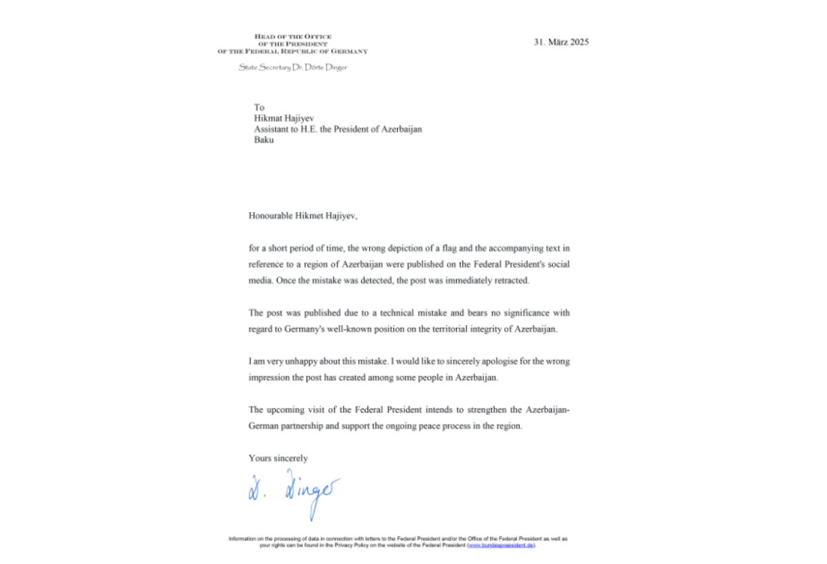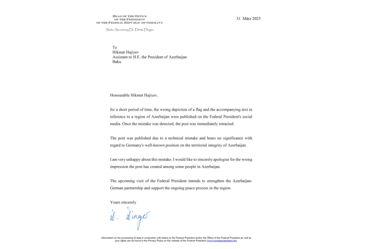 Такой прямой не нашел, пока все СМИ, которые я нашел ссылаются на соответствующую информации опубликованную на сайте госагентства Азертадж (пишут, что в письме, направленном от имени руководителя Администрации президента Германии Дёрте Дингер, выражены извинения за инцидент, и дано согласие на распространение письма в средствах массовой информации). Не думаю, что будут напрямую официально врать. Подождем, если врут, немцы отреагируют.