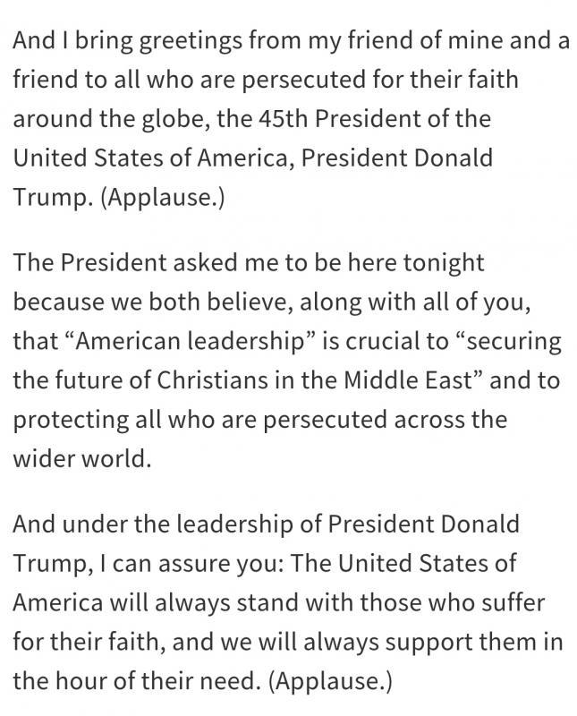 Вице-президент США Майк Пенс заявил, что христианство «подвергается беспрецедентным притеснениям в древних землях, где оно зарождалось». «В горах Сирии, в долинах Ливана, на Ниневийской равнине, в Армянском нагорье, от Тигра и Ефрата и до дельты Нила отцы нашей веры посеяли семена христианской религии», сказал он в среду вечером, выступая на приеме организации «В защиту христиан» (In Defense of Christians), задача которой – «привлечь внимание к бедственному положению христиан на Ближнем Востоке».