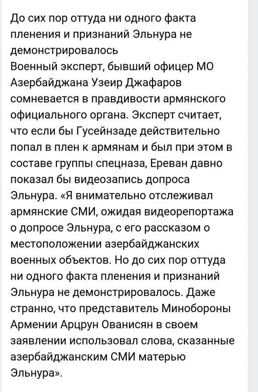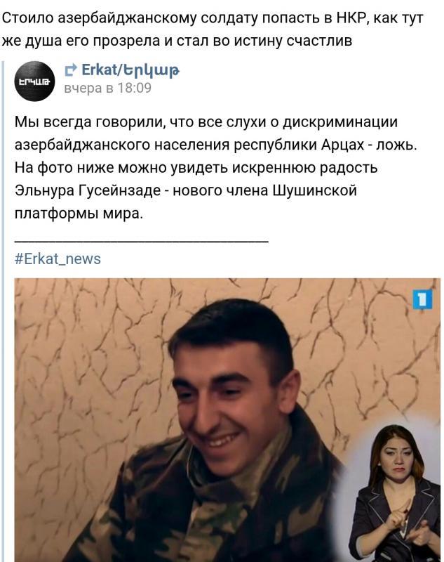 Привет от зимзимова Общественное телевидение Армении показало видео с пленным азербайджанским диверсантом Общественное телевидение Армении показало в пятницу видео с пленным азербайджанским диверсантом. Ранее карабахское оборонное ведомство сообщило, что в результате противодиверсионной операции армянским силам удалось пленить военнослужащего ВС Азербайджана Эльнура Хусейнзаде, 1995 года рождения, уроженца города Барда. Позднее азербайджанское Минобороны заявило, что указанное лицо демобилизовано из армии из-за нарушения дисциплины и не числится в вооруженных силах страны. Однако мать Хусейнзаде в интервью одному из азербайджанских СМИ сообщила, что ее сын является военнослужащим контрактной службы и о его пленении ее проинформировали в воинской части. Кадры, на которых изображен пленный, были показаны в эфире информационной программы «Оракарг».