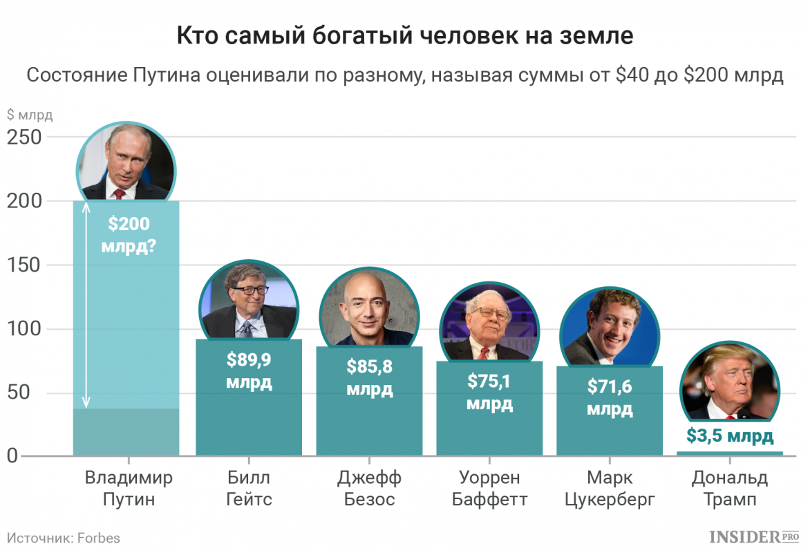 Владимиру Путину приписали состояние в $200 млрд Сегодня 13:24 2522 В то время Джефф Безос благодаря скачку акций Amazon (NASDAQ: AMZN)смог на сутки оттеснить Билла Гейтса и стать самым богатым человеком в мире по версии Forbes, исполнительный директор Hermitage Capital Management Уильям Браудер отдал этот титул другому человеку — президенту России Владимиру Путину. Как сообщает MarketWatch, об этом финансист заявил, выступая перед Юридическим комитетом Сената США, расследующим предполагаемое вмешательство России в президентские выборы. «Я считаю, что [Владимир Путин] стоит 200 млрд долларов», — сказал он. Подробнее на https://ru.insider.pro/topnews/2017-08-01/vladimiru-putinu-pripisali-sostoyanie-v-200-mlrd/