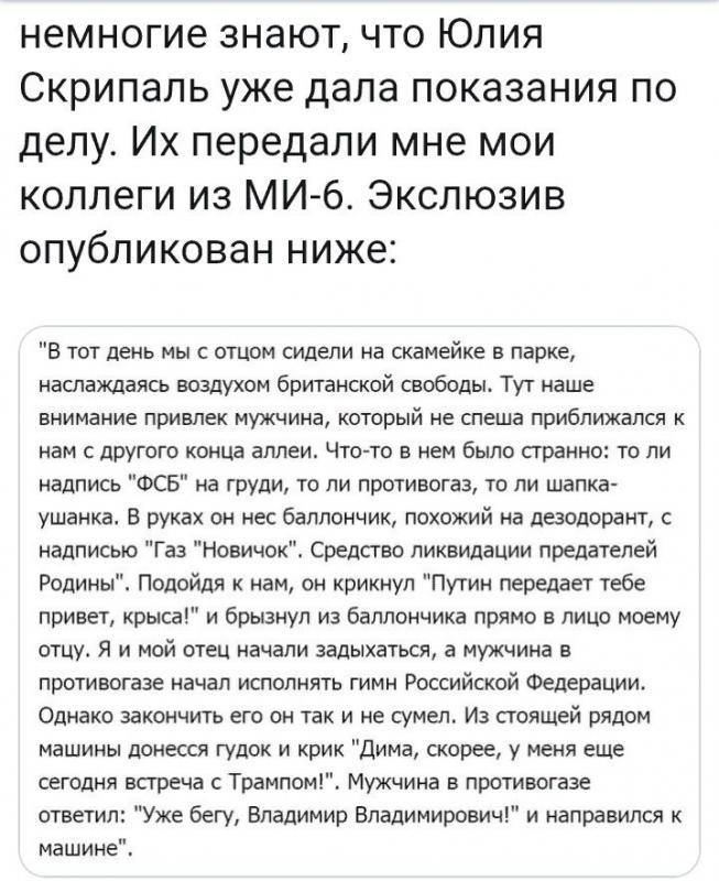Вот хоть убейте, но я не пойму в чём тут Путин неправ. Кто-то из нас чествует и восхищается предателями? И вообще такое чувство что Запад обо всем договорился с Путиным, все мол у нас готово, и послов вышлем и список стран готов, и санкции новые уже готовы, ты только не задерживай со Скрипалем. Так быстро последовали контрмеры без суда и следствия, что не поверила я ни одной стороне. Только девушку Юлию жалко и простых людей, которые страдают от всех санкций. А поверила я Асанджу , который из Лондона и сказал, что Тереза Мэй дура и политический труп. Если что, я за эти слова отвечать не буду, пусть Ассандж и отвечает, думаю, что скоро мы всё узнаем и он нас не разочарует в очередной раз.)