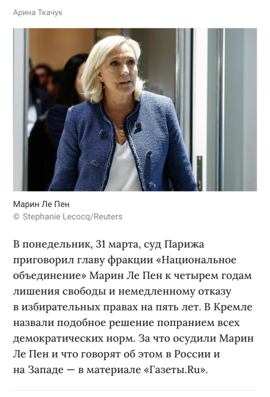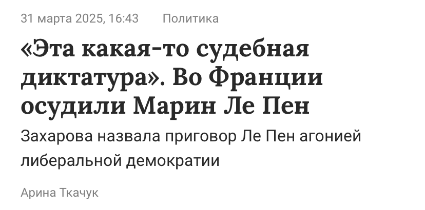 Ну вот, французскую 5-ую колонну задвинули на то место, куда, я уверен, в течение года будет задвинута (ПО БУКВЕ ЗАКОНА) и наша 5-ая колонна. Россия, конечно, запаниковала - своих не бросаем!))) Захарова негодует!))) но закон есть закон. https://www.gazeta.ru/politics/2025/03/31/20800808.shtml