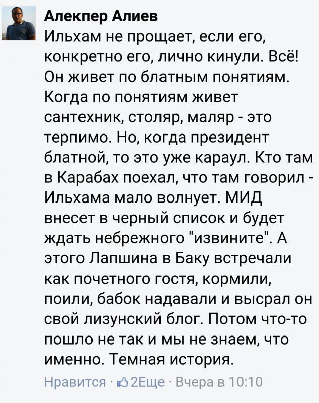 Лапшина выпустят и он, я уверен, приедет снова в Карабах.. ну или выскажет желание, типа - "мне пофиг мнение Азербайджана и я все равно поеду в Арцах"...