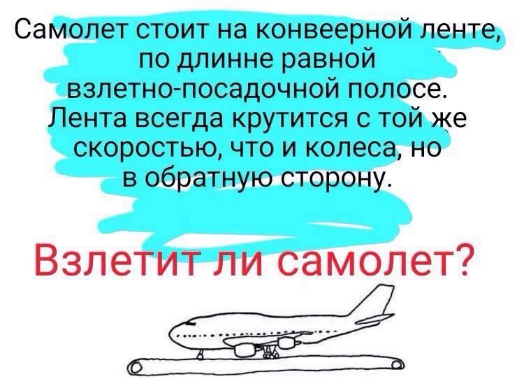 Самолёт (реактивный или винтовой) стоит на взлётной полосе с подвижным покрытием (типа транспортёра). Покрытие может двигаться против направления взлета самолёта. Оно имеет систему управления, которая отслеживает и подстраивает скорость движения полотна таким образом, чтобы скорость вращения колёс самолёта была равна скорости движения полотна. Вопрос: сможет ли самолёт взлететь в таких условиях?