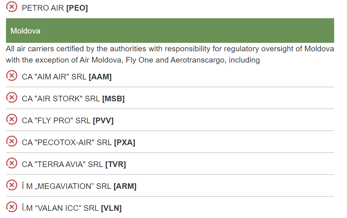 Мы говорим о праве гос органа лицензировать авиакомпании для полетов в Европу. Ни мы не молдаване этого делать не могут. Причем они уже два года не могут это делать, но это не мешает FLY-Pro лететь в дубай на 747 боинге, а Aim Air быть субподрядчиком Skylink Aviation и летать в центральную Африку, хотя они в этом листе.