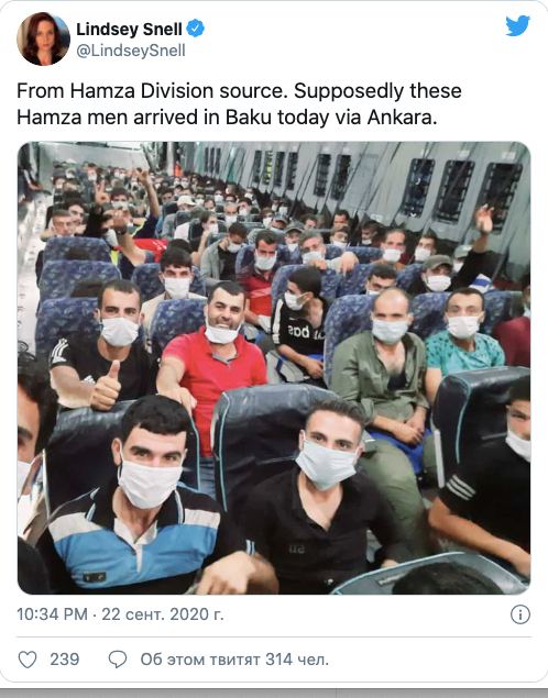 Журналистка Линдси Снелл, которую однажды похитили поддерживаемые Турцией террористы на севере Сирии, а затем бросили в турецкую тюрьму на два месяца после ее побега из Сирии, написала в Твиттере, что боевики из дивизии Хамза прибыли в столицу Азербайджана Баку через Турцию.