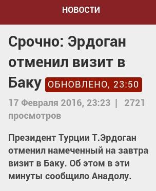Президент Турции Т.Эрдоган отменил намеченный на завтра визит в Баку. Об этом в эти минуты сообщило Анадолу.