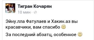 Բոլորիդ ստուգապես հավատացնում եմ, որ լուրը սուտ է, ավելին, Թալիշի ուղղությամբ, ինչպես հայտնել էի ավելի վաղ գրածս հանրագրում, ադրբեջանցիների վիճակն, ընդհակառակը, բավականին ծանր է։ Բոլորին կոչ եմ անում ադրբեջանական լրատվամիջոցներում Թալիշի առման մասին լուրեր հանդիպելիս չխաբվել։