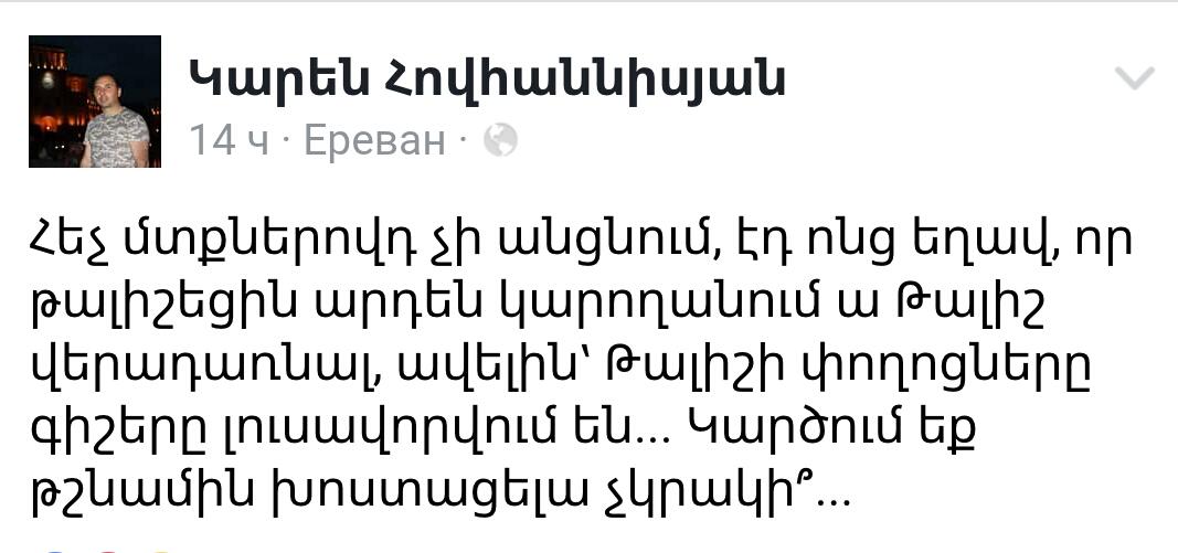Քանի օր է Արցախի հանրայինը խոսում է միայն Թալիշի վերաբնակեցումից, բայց երեկվանից ոչինչ չի ասում վիրավորների մասին: Սա ինչ է՞, աչքակապություն:՞»,- մասնավորապես, գրել է նա: