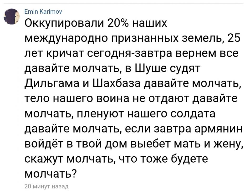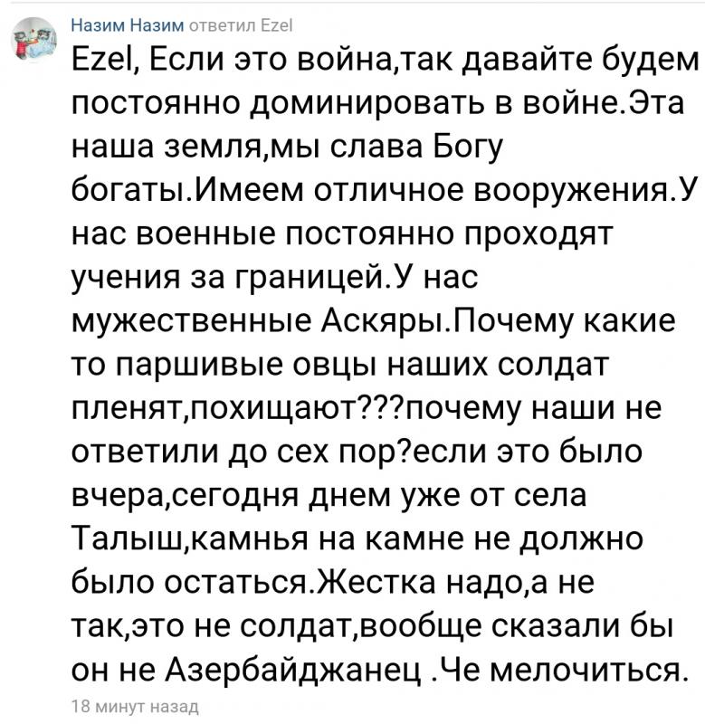 Тот факт, что в Азербайджане выбрали самый низкий и позорный для любого государства вариант - отказ от собственного военнослужащего, более чем красноречив во всех смыслах. "То, что азербайджанская сторона, каждый раз оказываясь в безвыходной ситуации, готова отказаться от собственного солдата и представить его, во-первых, дезертиром, а во-вторых – лицом, не имеющим какого-либо отношения к азербайджанским ВС, понятно и полностью умещается в логику действий азербайджанской стороны. Однако нелогично и в то же время непонятно, как может демобилизованный военнослужащий – в армейской форме, вооруженный и тем более в составе диверсионной группы – проникнуть в зону между боевыми позициями войск, пытаться выполнить спецоперацию и в итоге оказаться в руках армянской стороны? Вот вам и азербайджанское мышление", – подчеркнул пресс-секретарь Минобороны НКР Сенор Асратян. "Выходит, что азербайджанской стороне выгоднее иметь погибших героев или "героев-шизофреников", как Рамиль Сафаров", - в свою очередь заявил пресс-секретарь президента Арцаха Давид Бабаян.