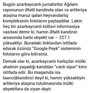 «Ադրբեջանական լրագրողներն այսօր Աղդամի շրջանի Էֆեթլի գյուղի անասնաբուծական ֆերմայի հրետակոծության հետևանքների լուսանկարներ են տարածել։ Սակայն ոչ մի ադրբեջանական լրատվամիջոց չի ասում, որ Էֆեթլի գյուղի հետևում ռազմական օբյեկտ կա. 227.1 բարձունքը, ստորև ինքներդ կարող եք Գուգլի արբանյակային լուսանկարներով դիտել։ Փաստորեն ադրբեջանցի զինվորականներն օգտագործում են ադրբեջանական գյուղը որպես պատնեշ և զարմանալի չէ, որ այդ բարձունքը հրետակոծելիս տուժում են նաև քաղաքացիական օբյեկտներ»։