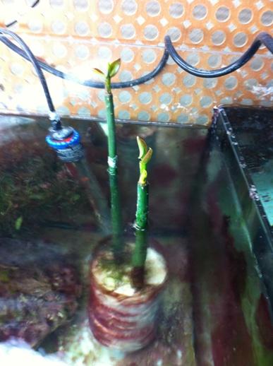 Сейчас нашлась только детская фото этого мангра – только проклюнулись листики из семян. Сейчас он вырос, разветвился и уперся в потолок тумбы, выглядит довольно причудливо, если не сказать уродливо, но в плане здоровья вопросов нет. А растет он в нижней подсобной емкости морского аквариума.