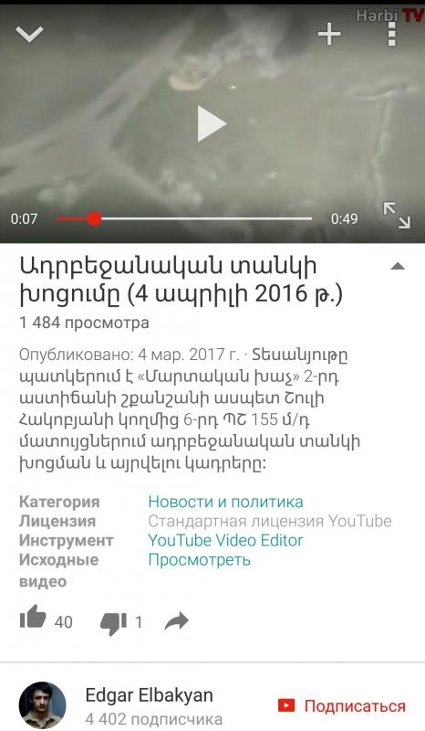Ты имеешь виду не на Hərbi TV, а каком-то другом ресурсе? Я собственно изначально так и подумал, что после своего небольшого конфуза 25 февраля 2017 они вытащили из загашника апрельское видео, припасенное для таких случаев. Но Нельс говорит Hərbi TV наш ресурс, а на других я этого видео не встречал. Но насчет того, что наш ресурс - у меня большие сомнения. Оформлен как азербайджанский - логотип, пафосный азербайджанский текст за кадром... А если бы это был армянский ресурс, который косит под азербайджанский, то зачем тогда он саморазоблачился?o.O