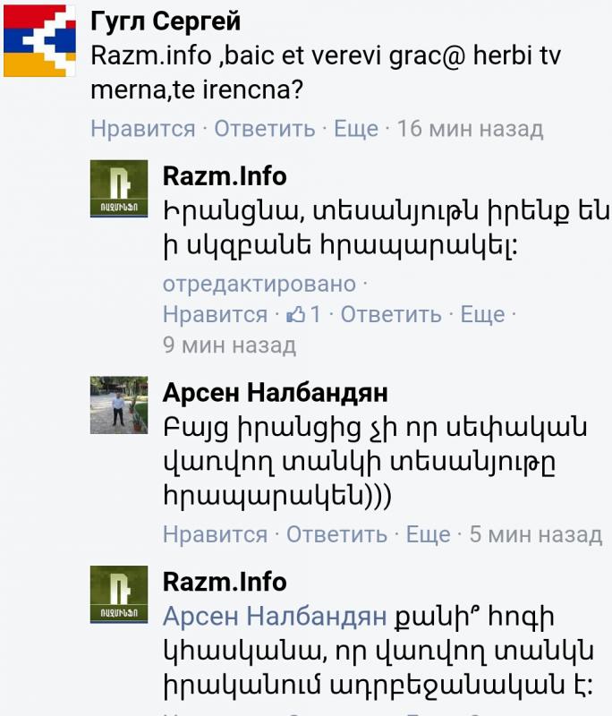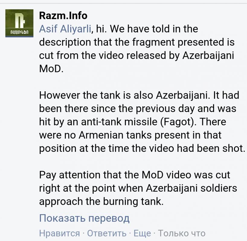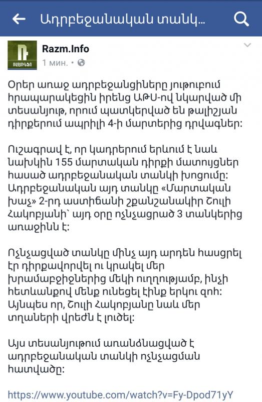 Ты имеешь виду не на Hərbi TV, а каком-то другом ресурсе? Я собственно изначально так и подумал, что после своего небольшого конфуза 25 февраля 2017 они вытащили из загашника апрельское видео, припасенное для таких случаев. Но Нельс говорит Hərbi TV наш ресурс, а на других я этого видео не встречал. Но насчет того, что наш ресурс - у меня большие сомнения. Оформлен как азербайджанский - логотип, пафосный азербайджанский текст за кадром... А если бы это был армянский ресурс, который косит под азербайджанский, то зачем тогда он саморазоблачился?o.O