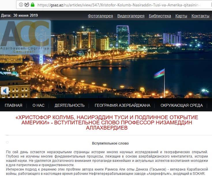 Кто-то собирает архив связанный с дикостью царящей в Азербайджане? Например, как они выдумывают себе историю? Я слегка офигел, когда узнал, что 3 августа 1492 года АЗЕРБАЙДЖАНСКИЙ путешественник Христофор Колумб отправился открывать Америку, используя карты составленные АЗЕРБАЙДЖАНСКИМ ученым Насреддином Туси. Это на сайте Географического общества Азербайджана написано.