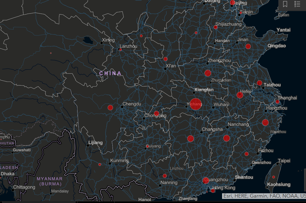 Посмотри на карту поражения. Почти весь Китай покрыт красными кружочками поражения. Чем крупнее кружочек, тем больше инфицированных.