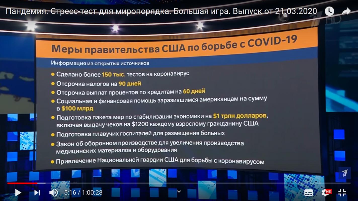 Рискую утяжелить странницу ещё одной картинкой, вот скрин с российской телепрограммы о результатах проделанной работы властями США. Один из пунктов - количество произведённых тестов - 150тыс. Напоминаю, на сегодня, 23 марта офиц. данные по США - 35тыс заражённых