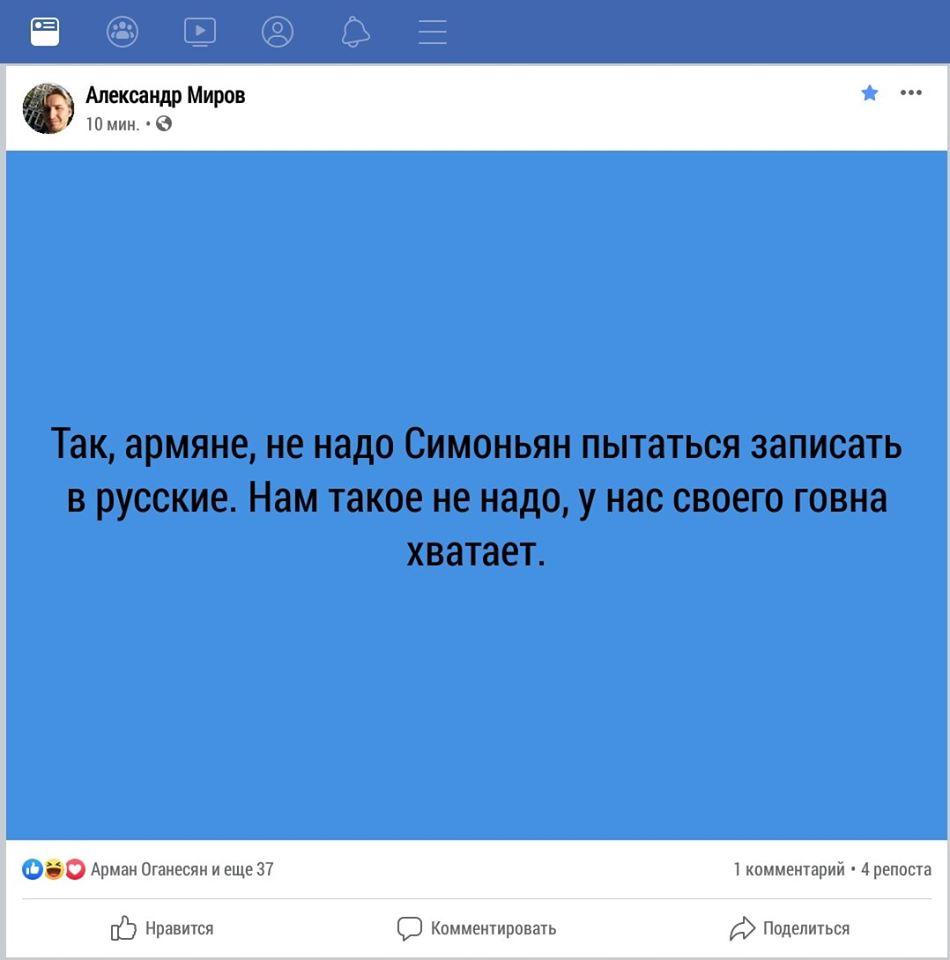 Мне кажется, до русских дошло, что «взрывающий» сеть своими высказываниями ненавидимый всеми армянский блогер всего лишь конвертирует ненависть к себе в ненависть к России, Кремлю, русскому посольству в Армении и, в целом, бесплатно выполняет всю работу за противника.