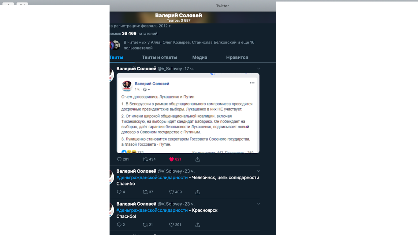 Вчера небезызвестный обладатель разных инсайдерских информаций Соловей и второй фамилию точно не помню, Пионтковский (?), утверждали что в Кремле уже окончательно принято решение провернуть быстрый "аншлюс" Беларуси в состав России и всё это подать белорусскому народу как избавление его от тирана Лукашенки, который безжалостно убивает свой собственный народ.
