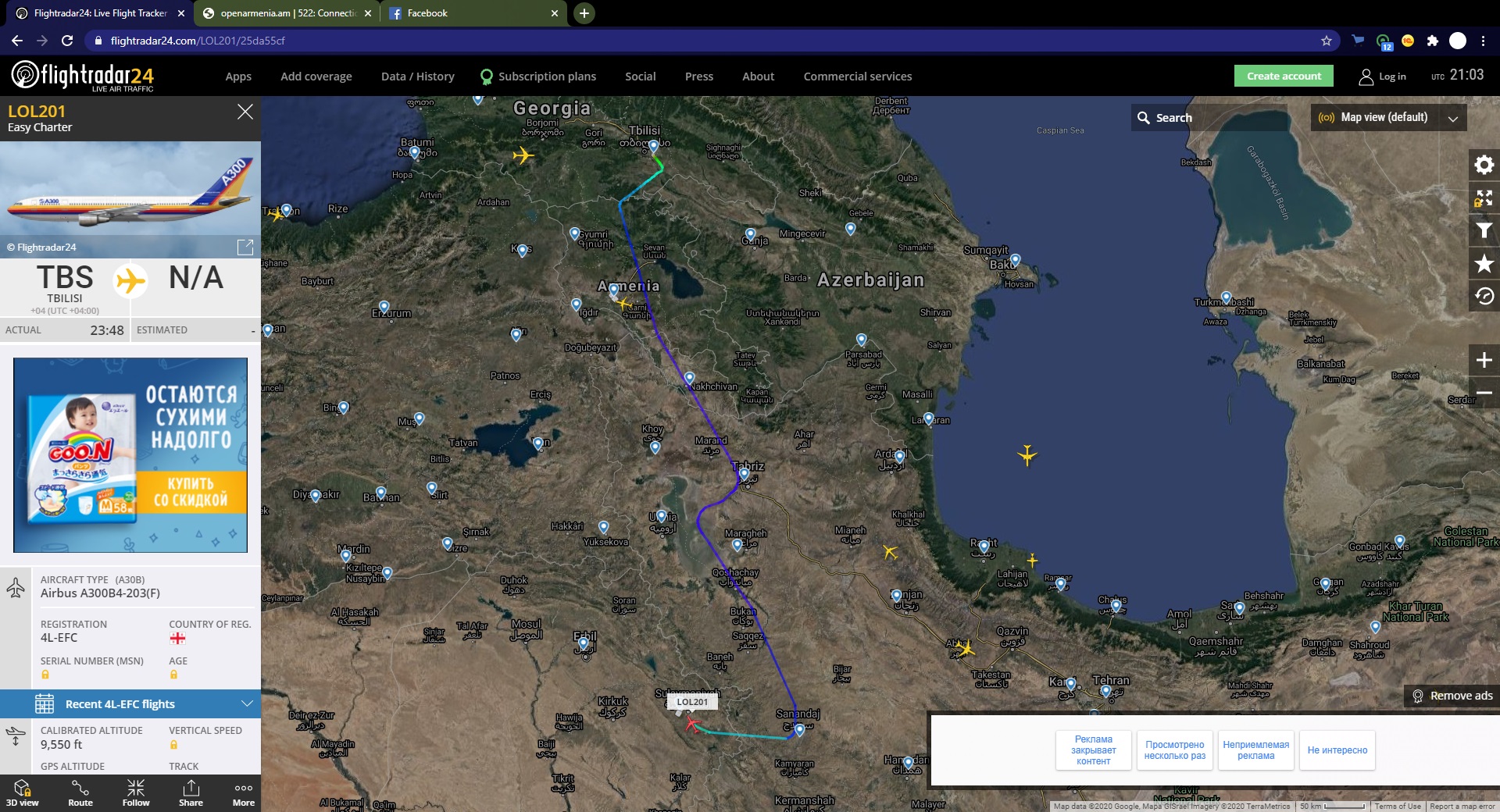 ️Прямо сейчас самолёт Минобороны Азербайджана летит над воздушным пространством Грузии.