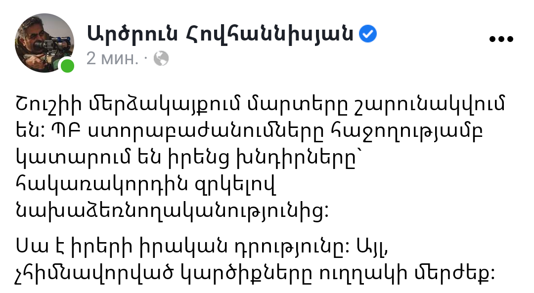 Շուշիի մերձակայքում մարտերը շարունակվում են: ՊԲ ստորաբաժանումները հաջողությամբ կատարում են իրենց խնդիրները` հակառակորդին զրկելով նախաձեռնողականությունից: