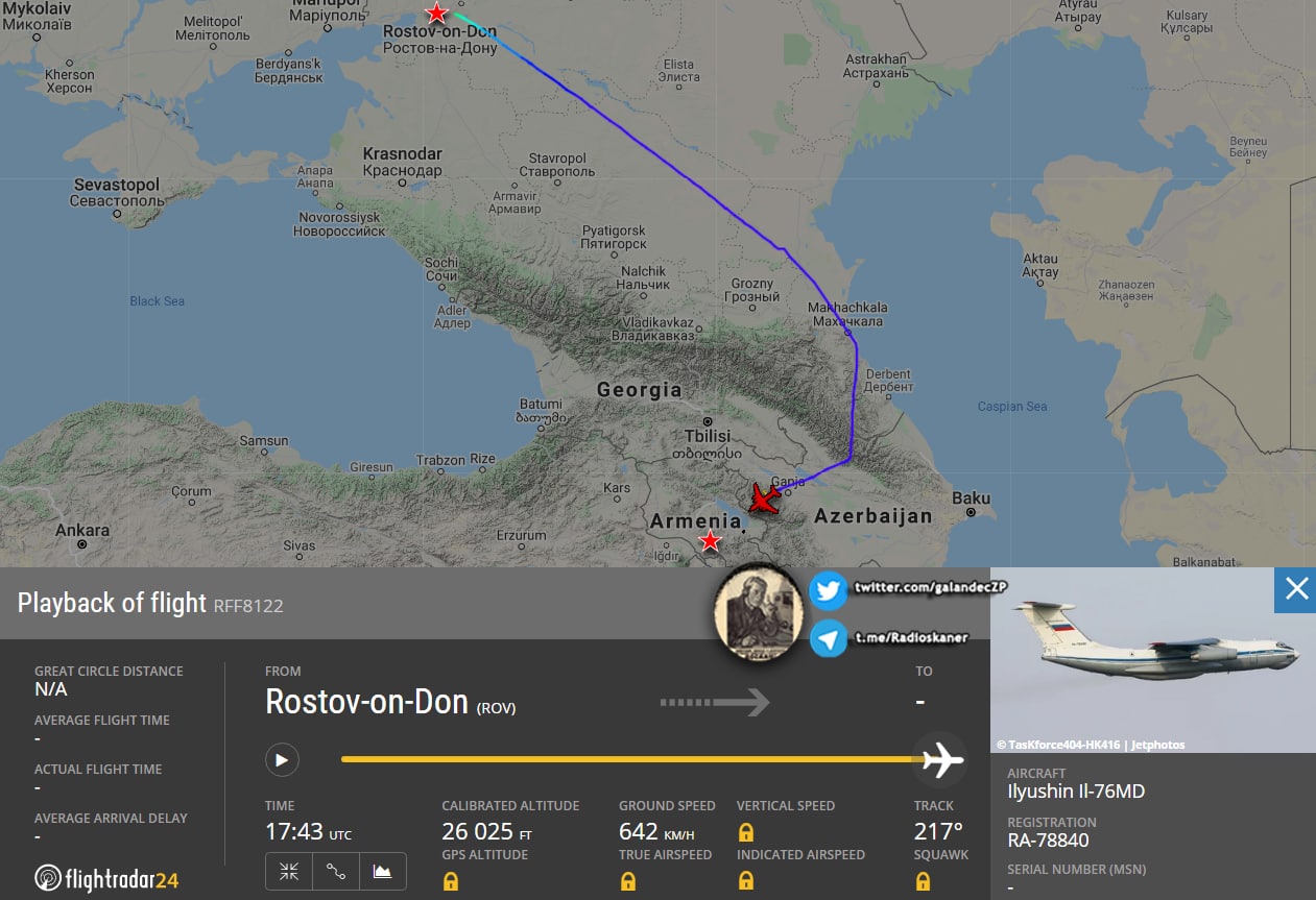 Второй день наблюдается повышенная активность транспортной авиации России в направлении Армении. Сегодня вечером с Ростова вылетел очередной Ил-76 в Ереван. Всего за 2 дня ВКС России выполнили около 6 рейсов (1 Ан-124, 5 Ил-76)