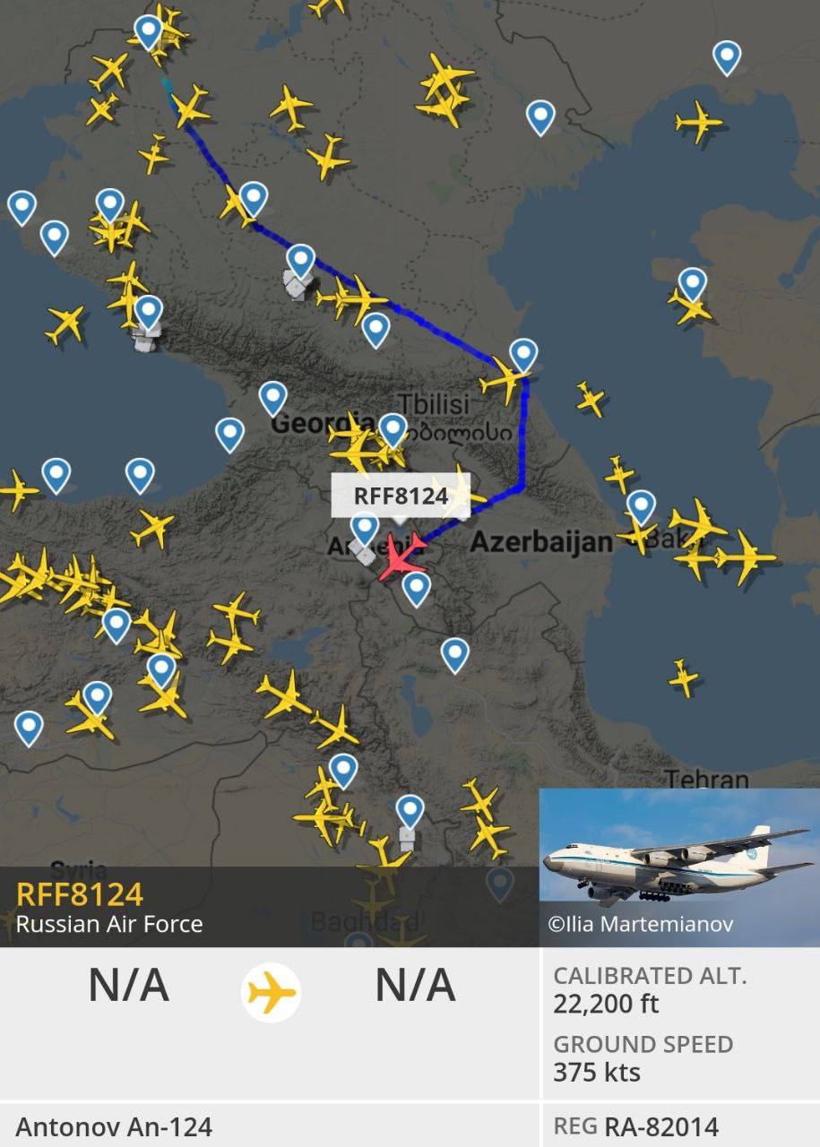 Несмотря на рост напряженности вокруг Украины, Россия продолжает поставки военного имущества в Армению: сегодня вечером в Ереван прибыло 2 Ил-76 ВКС России из Ростова и Ан-124 с грузом в виде вертолётов из завода в Улан-Удэ.