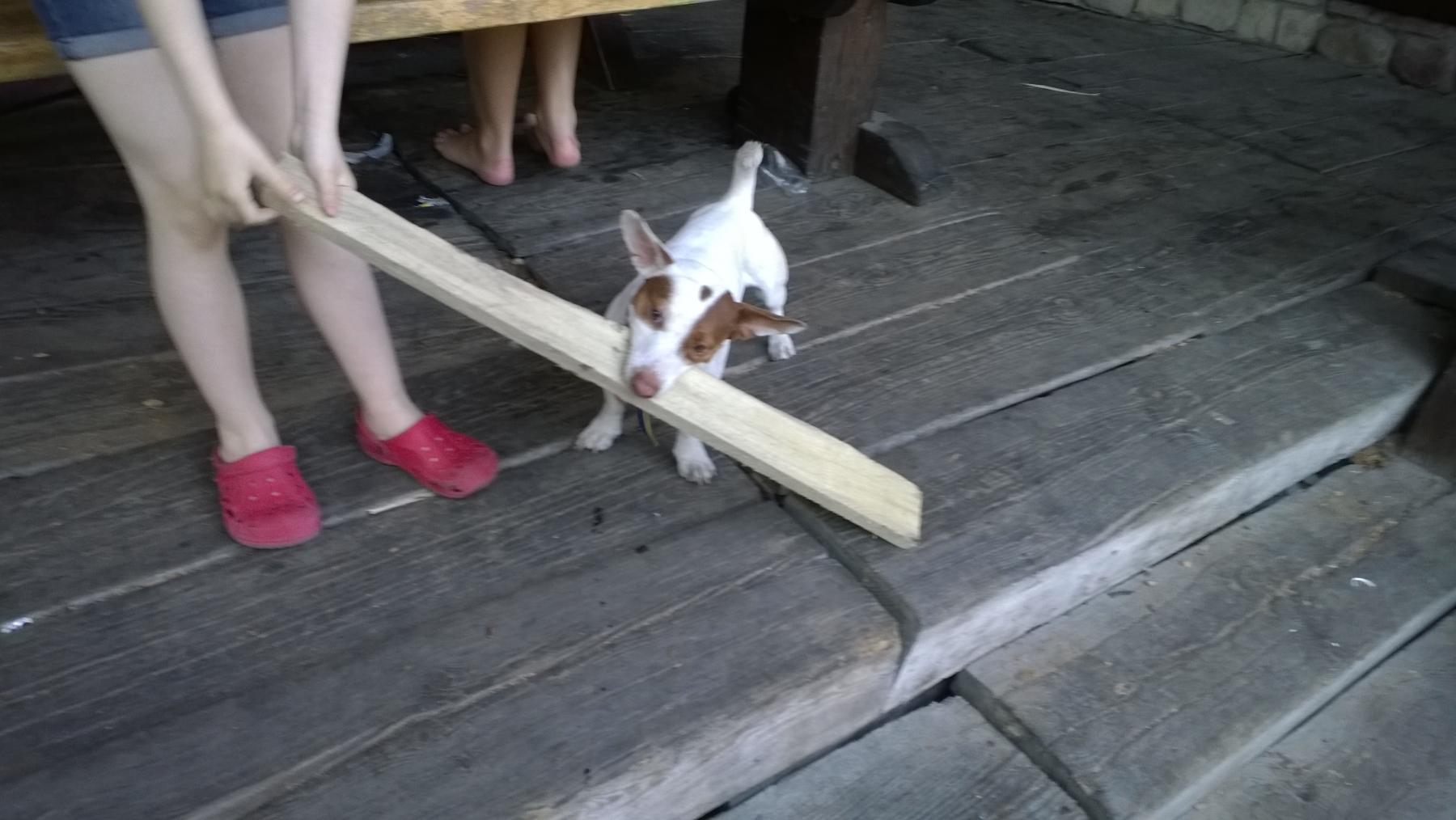 Собакин друзей, зовут Каспер, порода джек рассел, ну он еще альбинос. Вот скажите, как это маленькое создание может таскать в пасти это бревно целый день? Оно же весит больше него!!!