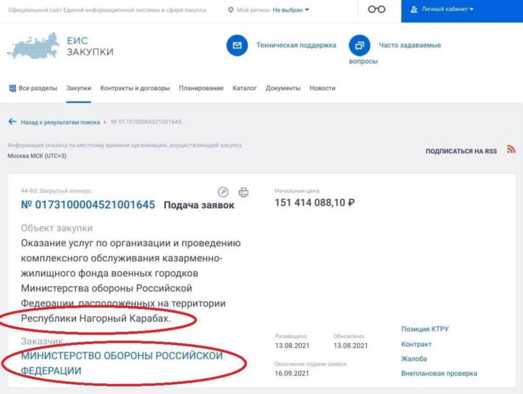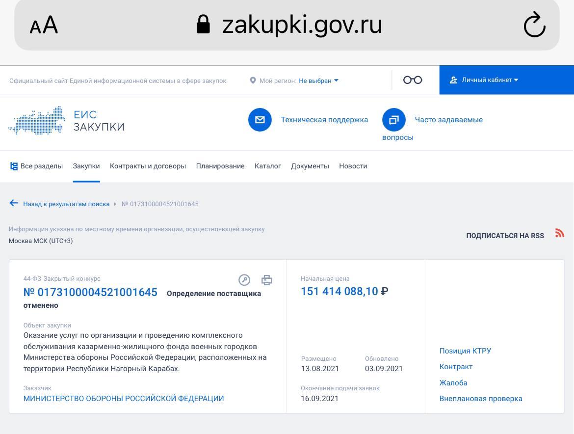 🇷🇺🇦🇿 МО РФ отменило услугу по организации и проведению комплексного обслуживания казарменно-жилищного фонда военных городков Министерства обороны Российской Федерации, расположенных на территории «Республики Арцах». Но «Республика Арцах» с официального сайта единой информационной системы в сфере закупок остался.