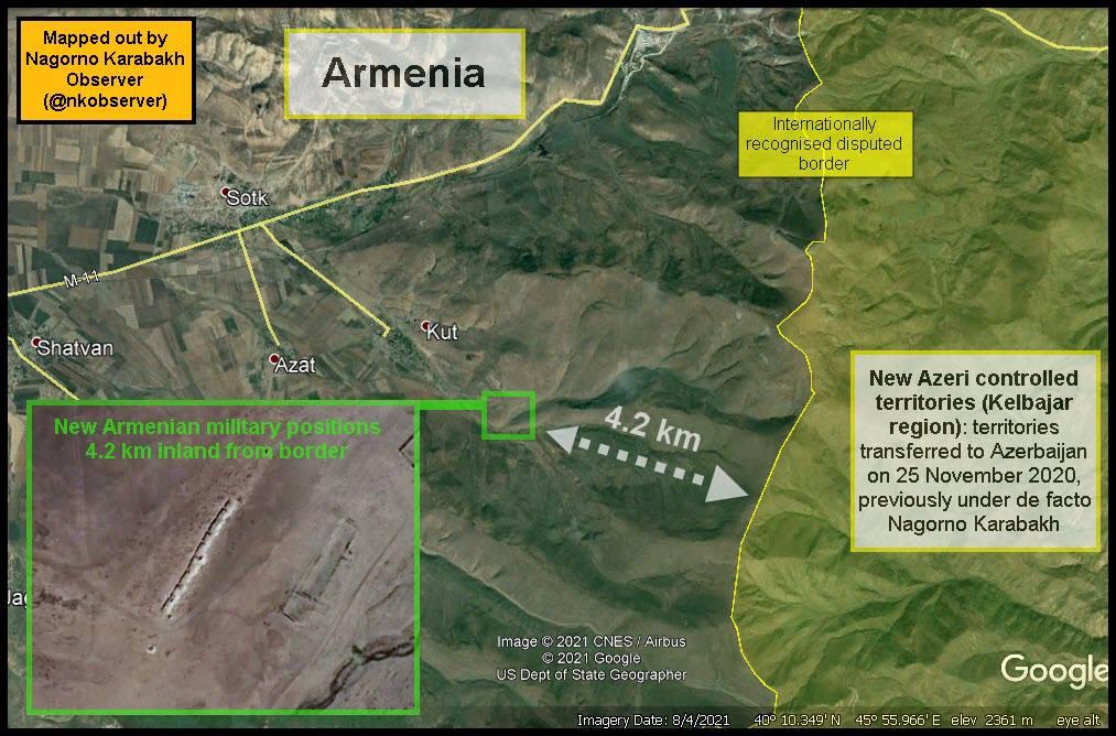 Недавние спутниковые снимки показывают новые армянские военные позиции в 4,2 км от границы с ВС Азербайджаном, которые находятся на временно оккупированой территории Арцаха. Возможно, это 2-я или 3-я линия защиты, но, скорее всего, нет. Известно, что азербайджанские военные сейчас контролируют некоторые горные вершины в самой Армении в этом районе.