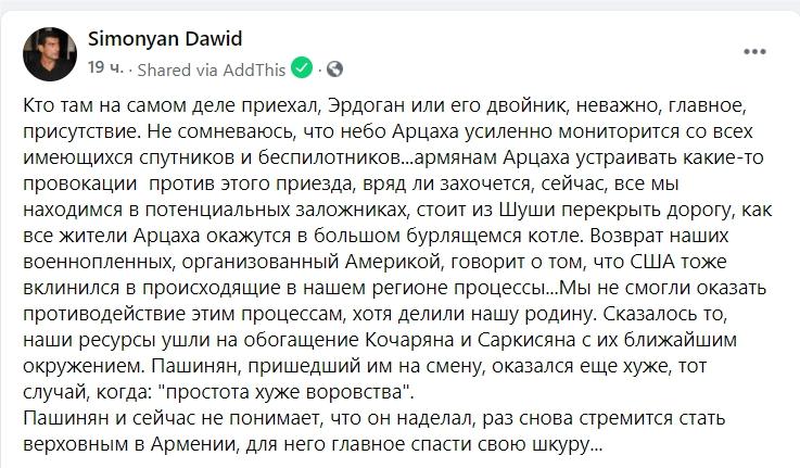 Примерно о том же и я говорил после 9 ноября, что нужно уточнить с РФ какие у неё планы, чтобы не стать разменной монетой. Но никол не тот человек, который будет что-то уточнять. Надоело слушать про дружбу ВВП и РК, они оба смертны, поэтому как верно некоторые заметили тут на форуме, это не вариант. СС явно для галочки участвует в выборах, иначе не отправлял бы на амбразуру генерала Ванецяна блистать в СМИ.