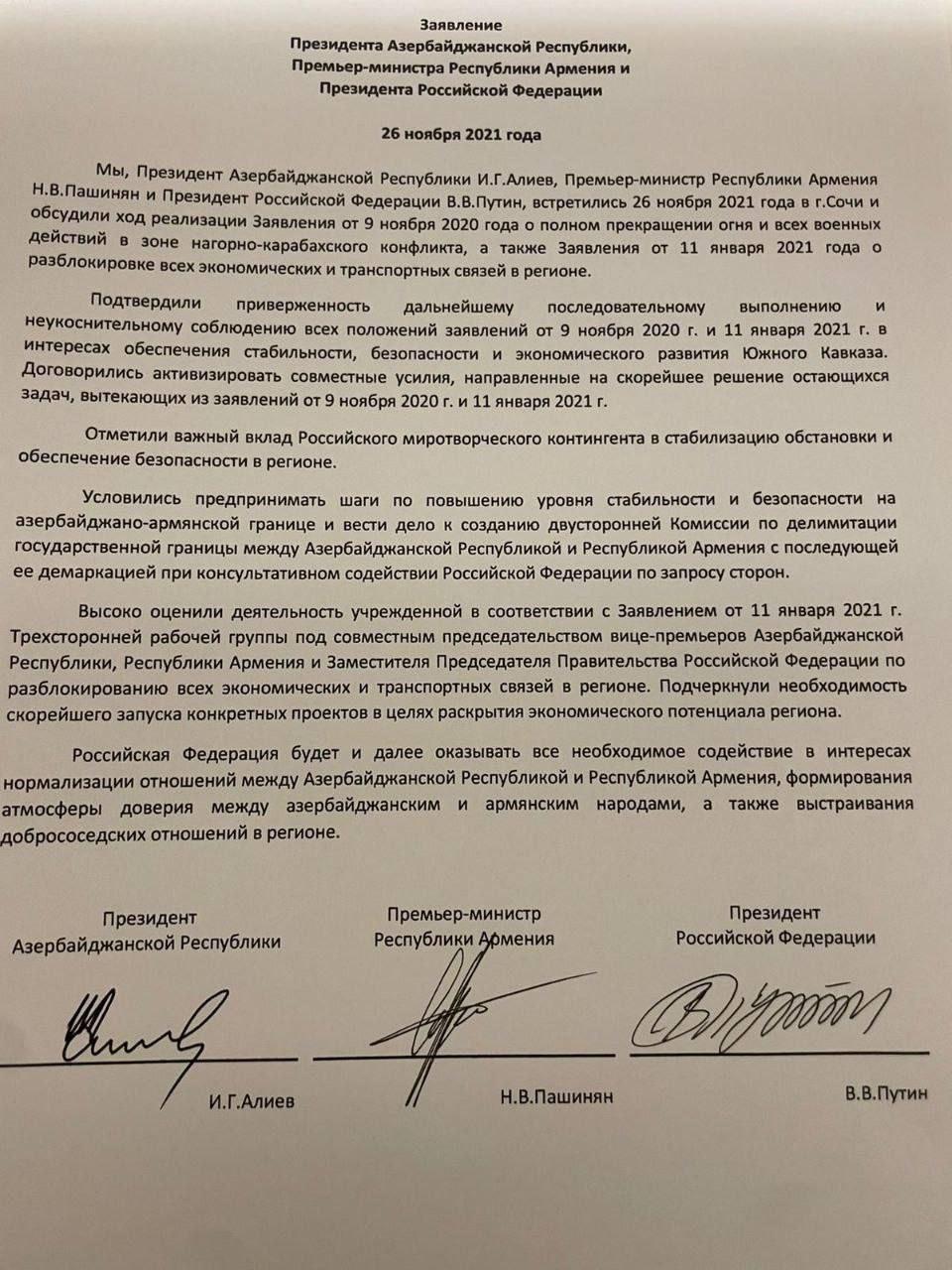 По итогам трехсторонней встречи с главами Армении и Азербайджана, президент России отметил, что сторонам на переговорах по Карабаху удалось продвинуться по гуманитарным вопросам, договорились о разблокировании транспортных коридоров. Никаких препятствий для работы по демаркации границы между Арменией и Азербайджаном нет.
