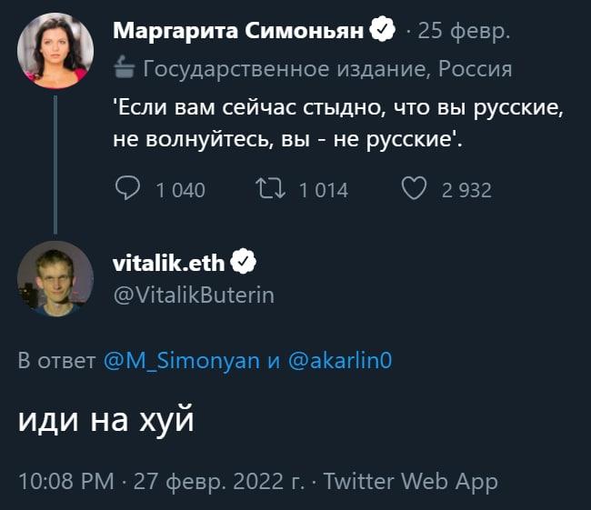 Из всего этого,я могу сделать вывод,что дела в Украине у русских обстоят не очень,коль решили старую шарманку о я.о. включить плюс белорусский спецназ пригласить.Да и поведение флюгеров Ильюши и его старшего брата о многом говорят.Я ещё могу предположить применение я.о. в случае,когда ворог стоит у порога Москвы и отступать некуда,да и палить как Кутузов жалко,но чтобы из за искусственного образования,придуманного Лениным?Ни-за- что.Ну и в хижине дяди Тома сидят не дураки и отслеживают всё,зная все карты.Это у русских и армян вседа ВААААЙ,АРРЭ hаааа,зимой снег выпал, а харьковчане с цветами не встретили.У Тома всё посерьёзному,он считать умеет.