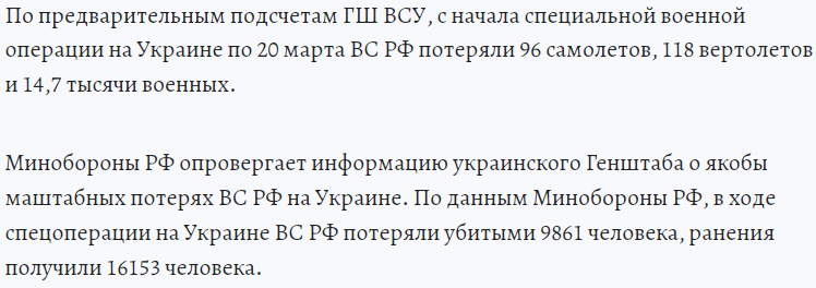 на КП вчера появился и тут же был удален  пропагандистский материал, в котором МО РФ РАЗОБЛАЧАЕТ ФЕЙК О ПОТЕРЯХ РФ В УКРАИНЕ. Но этот материал остался в веб-врхиве. Каждый может перейти по ссылке и ознакомиться,