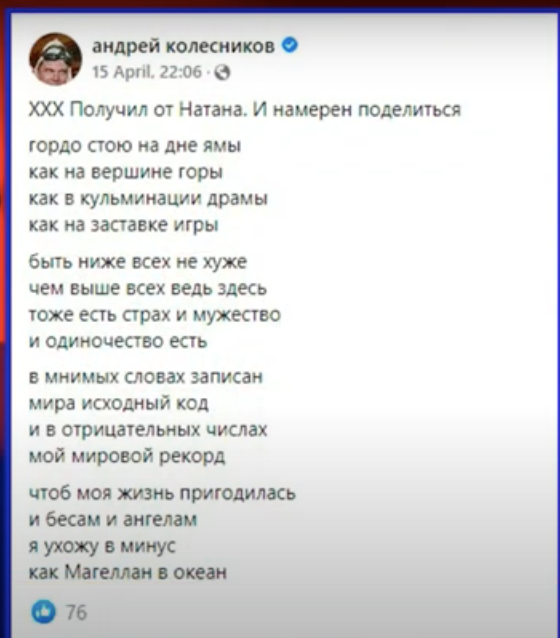Кстати в в своем последнем стихотворении он поэтически подтвердил свои страдания.