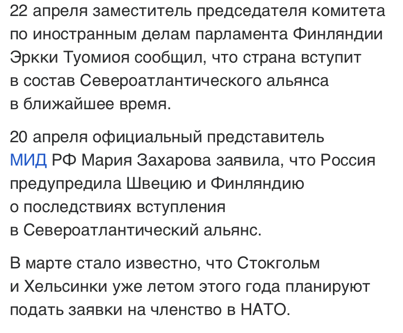 Какое собачье дело Марие Zахаровой и всея РФ вступят фины и шведы  в НАТО или нет? На две страны меньше будет в перспективе напасть? Уепищное государство