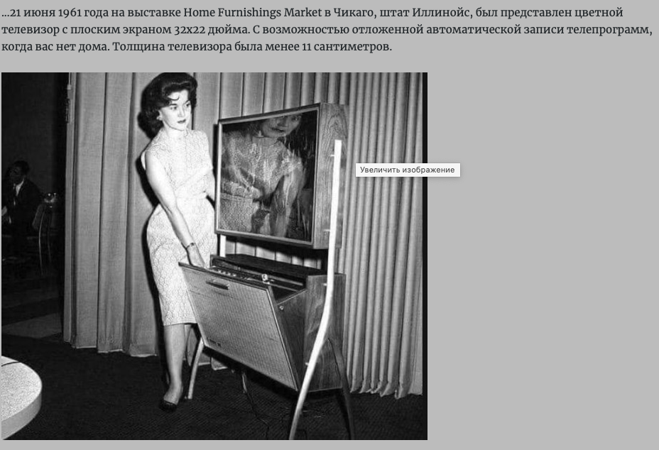 ...21 июня 1961 года на выставке Home Furnishings Market в Чикаго, штат Иллинойс, был представлен цветной телевизор с плоским экраном 32х22 дюйма. С возможностью отложенной автоматической записи телепрограмм, когда вас нет дома. Толщина телевизора была менее 11 сантиметров.