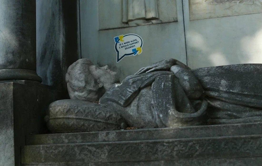 Украинские беженцы посетили парижское кладбище Пер-Лашез. Они обклеили наиболее посещаемые могилы знаменитостей сине-желтыми стикерами с надписью по-английски "Если бы я был жив, то поддержал бы Зеленского". В потусторонюю группу поддержки попали Бальзак, Шопен, Марсель Марсо, Эдит Пиаф, Айседора Дункан, Джим Моррисон и др.