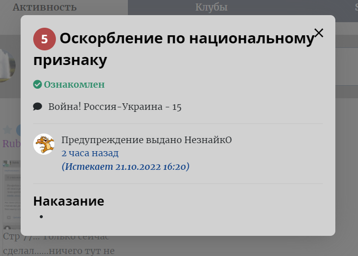 У тебя есть уведомление, в котором отображается полная информация, о выданных баллах и причине, в данном случае за оскорбление по нац признаку и о том кто и когда именно ,выдал эти баллы