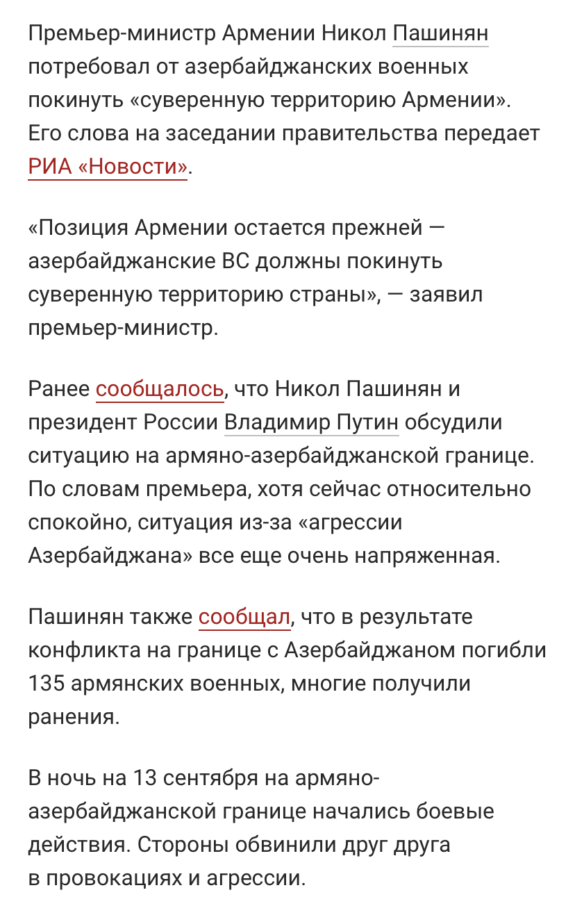 Российское государственное информагенство «РИА НОВОСТИ» решило преподнести своим читателям новость, при этом наглым образом исказив слова премьер-министра и преподав эту новость так, якобы Пашинян сказал: «потери армянской стороны в результате обострения ситуации на азербайджанской границе - 135 человек убитыми».