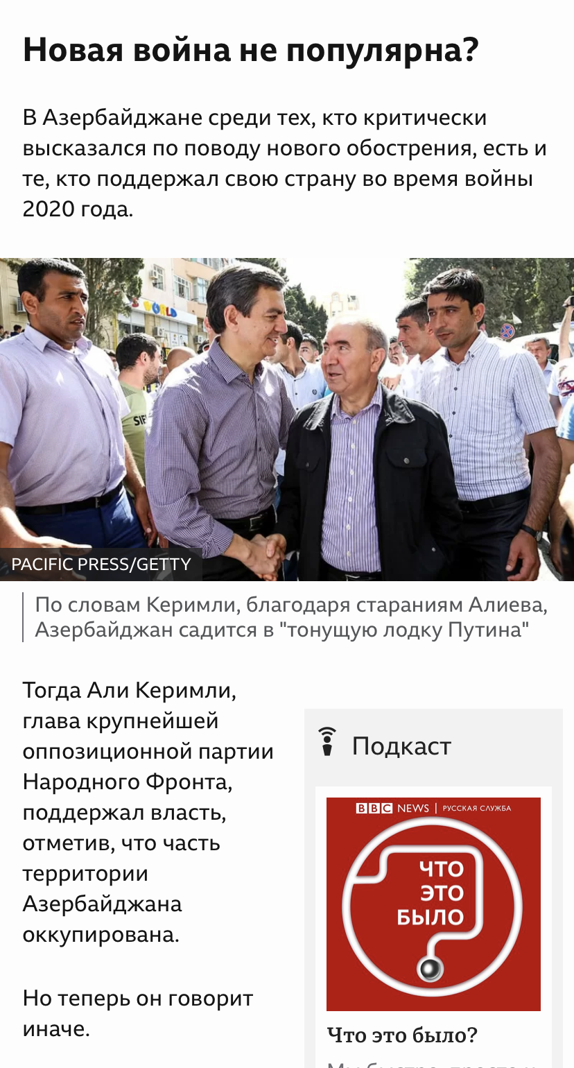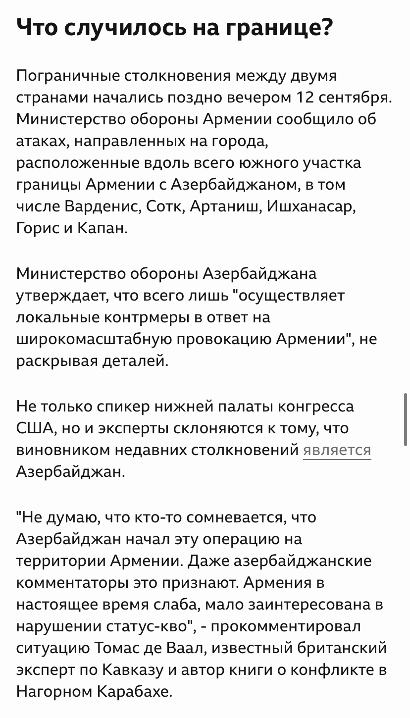 BBC, как вижу, при освещении событий и новостей сделал однозначный крен в сторону Армении. Это, думаю - определённый признак тенденции изменения вектора политики весьмира (ну, кроме РФ и традиционных диктаторских союзников Азербайджана) в сторону однозначного осуждения агрессивного Азербайджана и поддержки Армении.