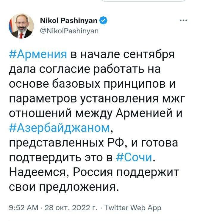Путин вчера заявил, что Армения отказывается от московских предложений по арм-аз урегулированию. Пашинян, в ответ, говорит, мол "Путин лжет, мы еще в начале сентября согласились!".