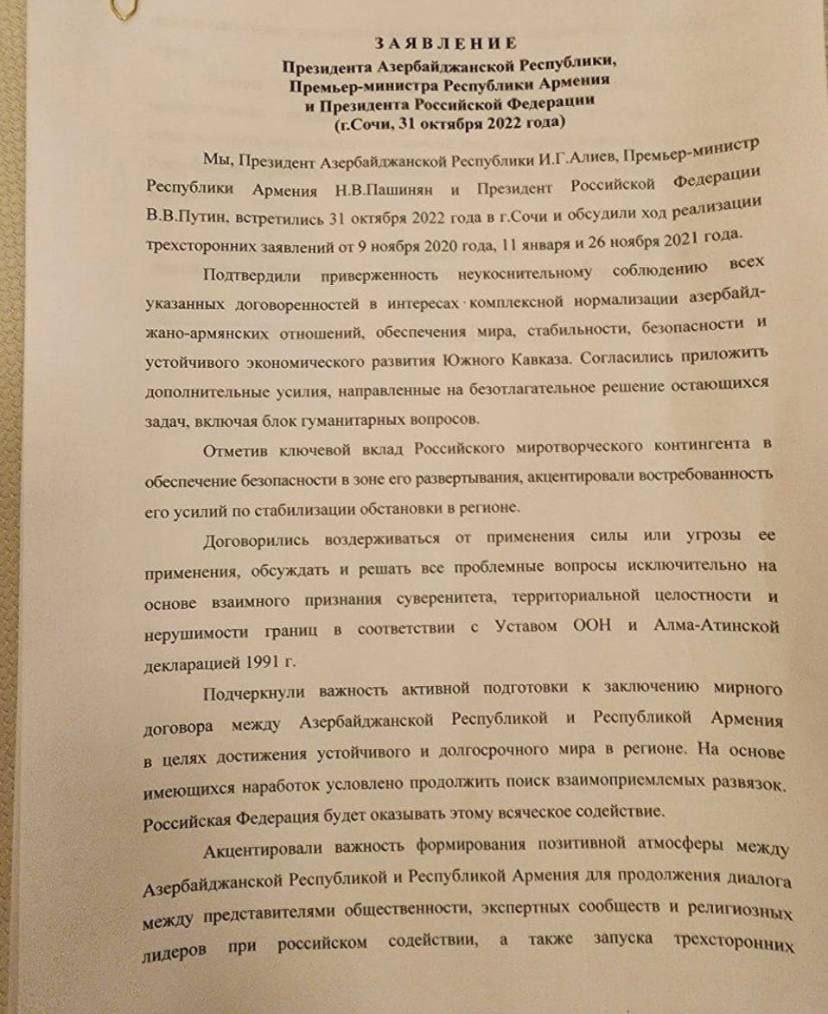 ️В сеть попал текст совместного заявления лидеров Армении, России и Азербайджана.