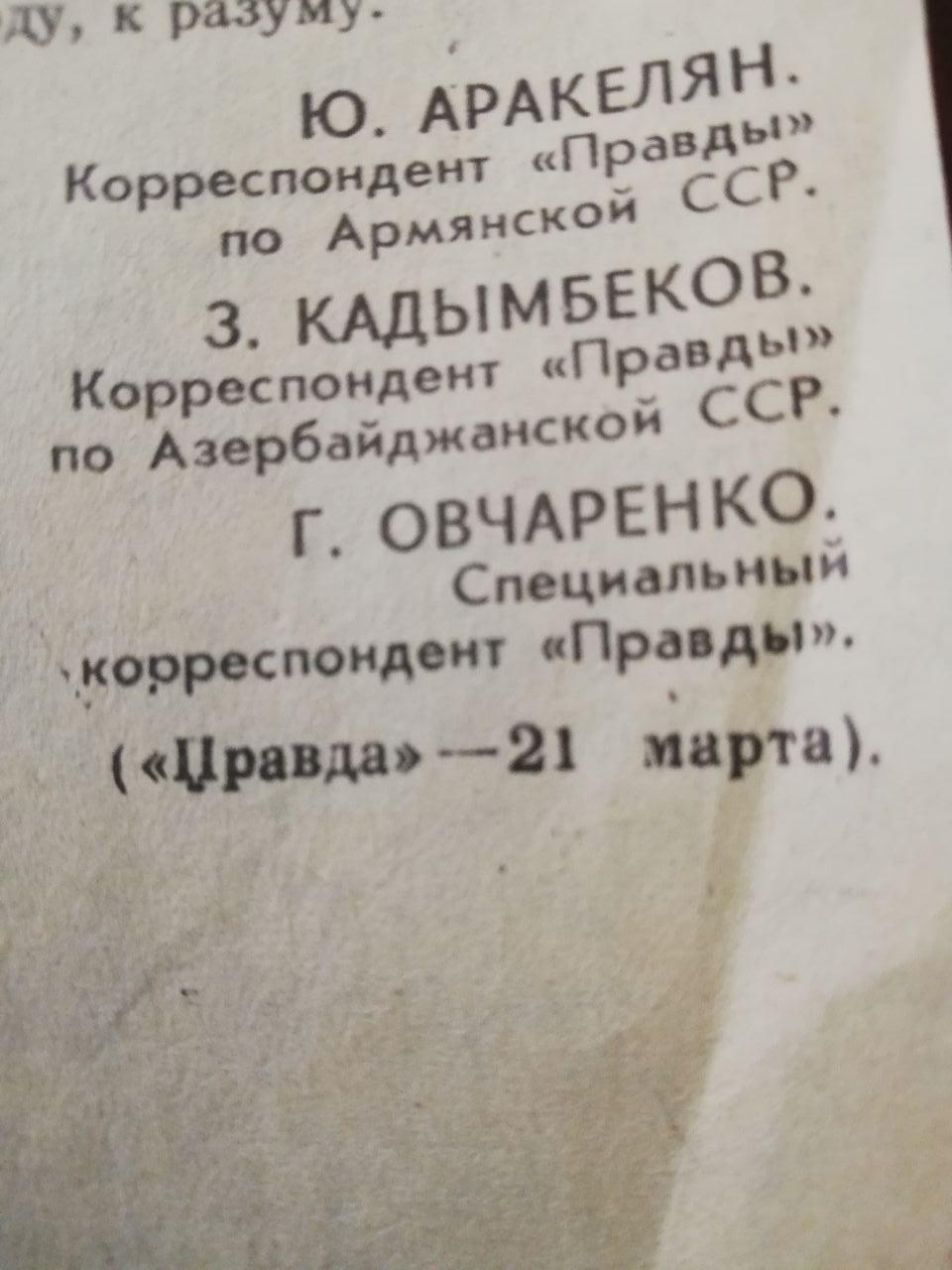 "......   В пылу споров, которые только разобщают народы,  были преданы забвению принципы ленинской национальной политики. Смысл образования Союза Советских Социалистических Республик состоял как раз в том, чтобы, бережно сохраняя язык, культуру, традиции каждого народа, каждой народности, положить конец национальным  распрям, попыткам одного народа доказать свое превосходство над другим.  И когда определялась территориальная принадлежность того же Нагорного Арцаха, коммунисты Кавказского бюро Р К П (б) прежде всего брали  в расчет главное: в какой республике регион сможет быстрее экономически и социально развиваться, чтобы лучше стала жизнь людей.