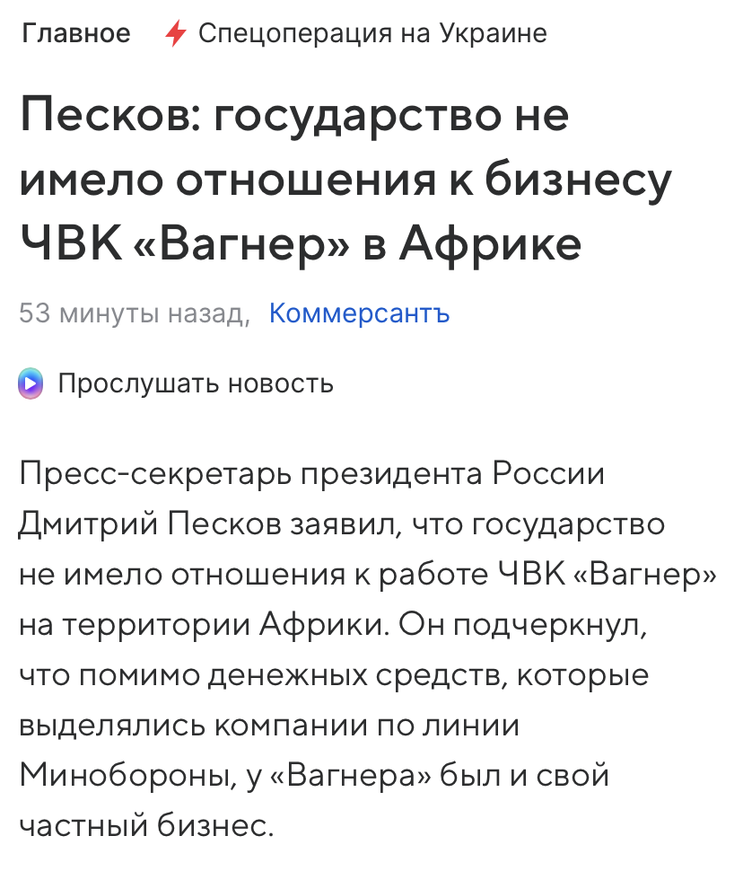 Короче, государство финансировало Вагнер, но «к бизнесу в Африке», в том числе и к каким-то непонятным военным действиям/участиям в вооруженных конфликтах на территории Африки, государство отношения не имеет - оно просто не в курсе )))
